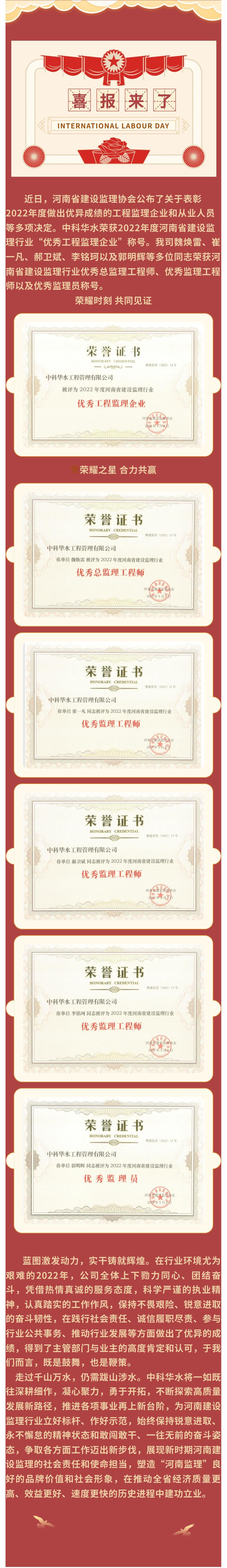 喜報!中科華水榮獲2022年度河南省建設監理行業“優秀工程監理企業”稱号